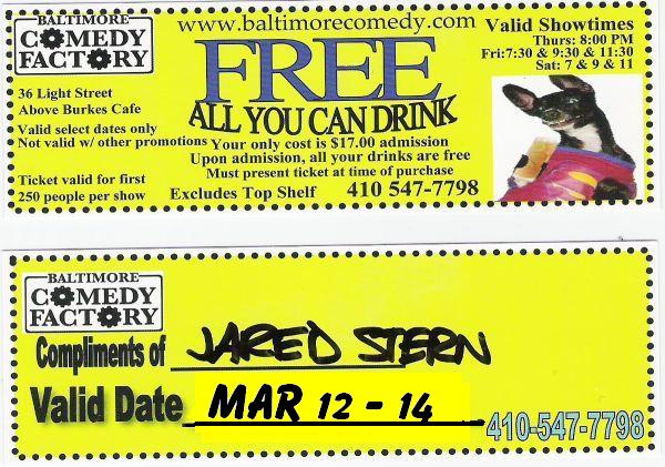 Ok, that’s enough random crap. Back to me. Remember, if you enjoy the blog, you should extrapolate that to liking me and check out my Facebook fan page. Declare your undying…like. Also, starting Thursday night, I’m kicking off another can’t-miss fun weekend at one of my favorite clubs, the Baltimore Comedy Factory. And if you don’t enjoy sobriety, then have I got a deal for you: See me, drink free. Just print out this handy-dandy coupon to pickle you, whilst I tickle you…