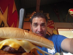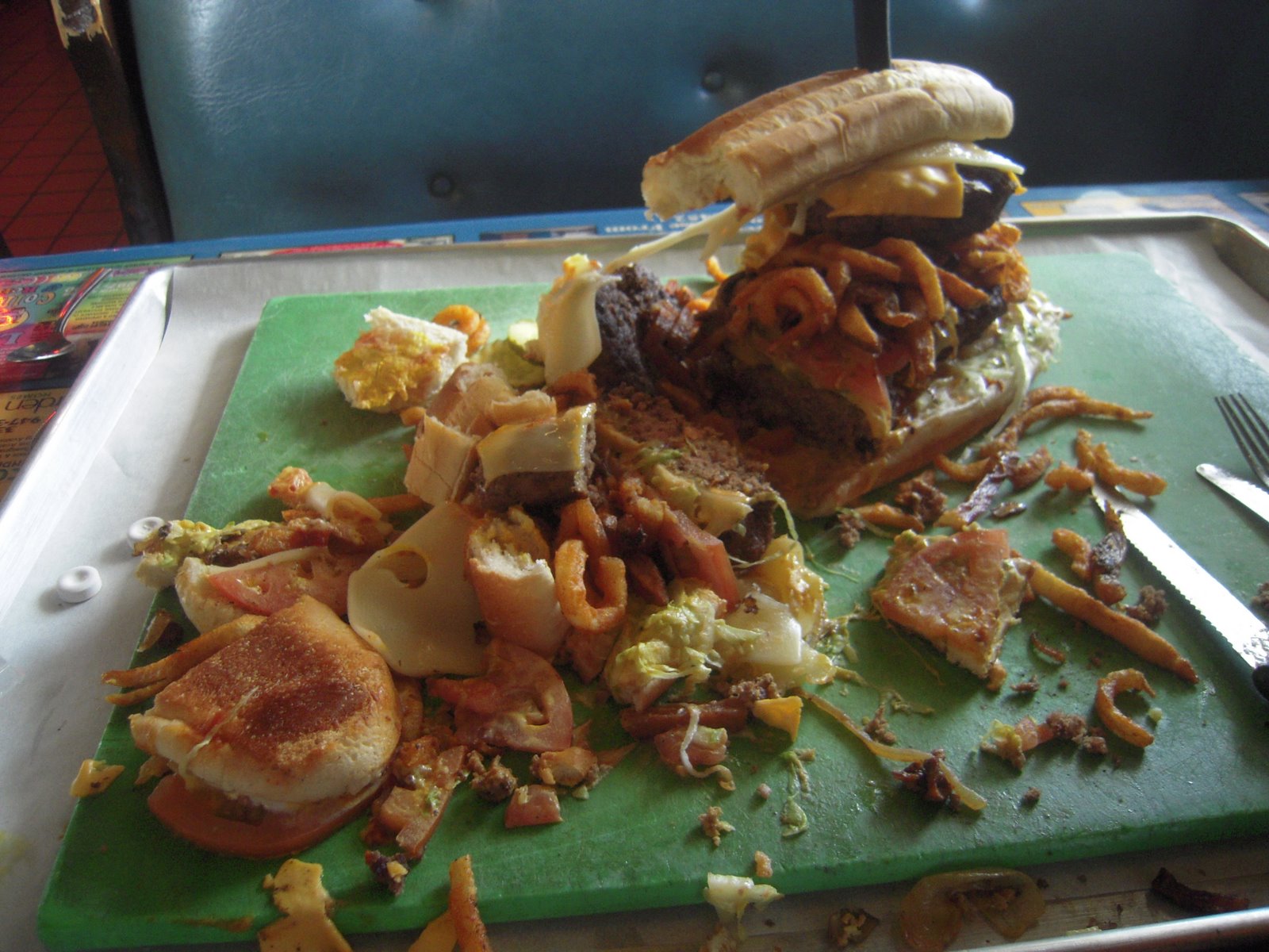 The Stuanator is a double-decker cheeseburger sub, with six 1/2 pound burger patties, two kinds of cheese, french fries and curly fries, along with the usual fixin’s. Only 11 people have attempted to finish this behemoth in the allotted 30 minutes. To the victor go the spoils of a free t-shirt, a free sandwich, and immortality…until you keel over from the coronary. Only 2 have succeeded. I’m a glutton for…gluttony, so I figured I’d give it a go. When I announced that I’d be attempting the Stuanator, I became a celebrity inside the restaurant. People were snapping shots of me with their camera phones. One lady asked me to sign her menu. I had no idea what I was in for…