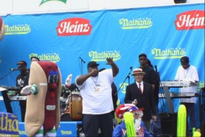 Speaking of way cool technology that can keep you in a perpetual loop, let’s hop in the fuzzy recollection machine and take a trip back to July 4th to strain our eyes at the blurred and hazy events. To celebrate our nation’s independence, my intrepid band of friends and I took a trip to Coney Island to witness the gluttonous grudge match known as the Nathan’s Famous Fourth of July International Hot Dog Eating Contest